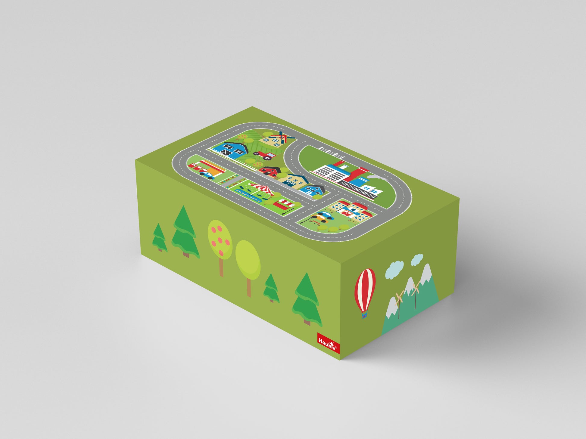 Die Straßenhaube präsentiert eine kurvige Straße, gesäumt von stilisierten Häusern und Bäumen. Sie ist so gestaltet, dass sie mit Spielzeugautos befahrbar ist, was Kindern ermöglicht, eigene kleine Abenteuer zu erleben. Die klaren Linien und einfachen Formen fördern kreatives Spielen und Geschichtenerzählen.